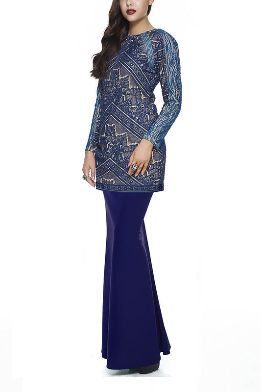 BLUE JINTAN - MODERN BAJU KURUNG WITH 3 VIBRANT EMBROIDERED LACE PANELLINGS (BLUE)