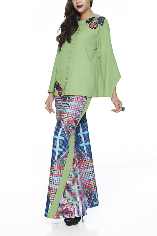 GREEN SERAI - MODERN GLITTERY FABRIC BAJU KURUNG WITH COLOURFUL BUTTERFLY AND FLORAL PATCHES (GREEN)