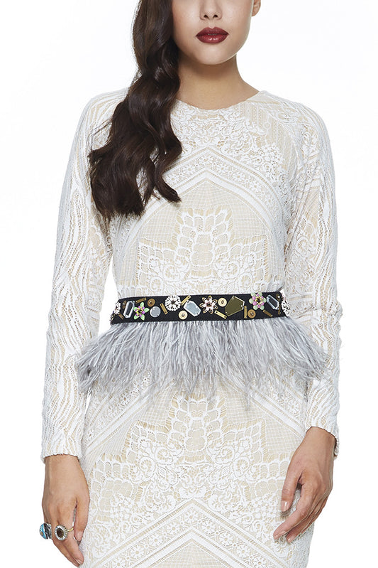 WHITE DELIMA - FEATHER BELT WITH METAL FLOWERS, ACRYLIC MIRRORS AND BEADING DETAILS (WHITE)