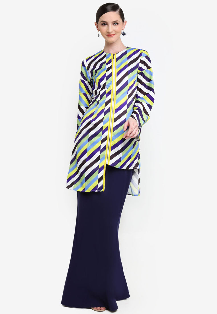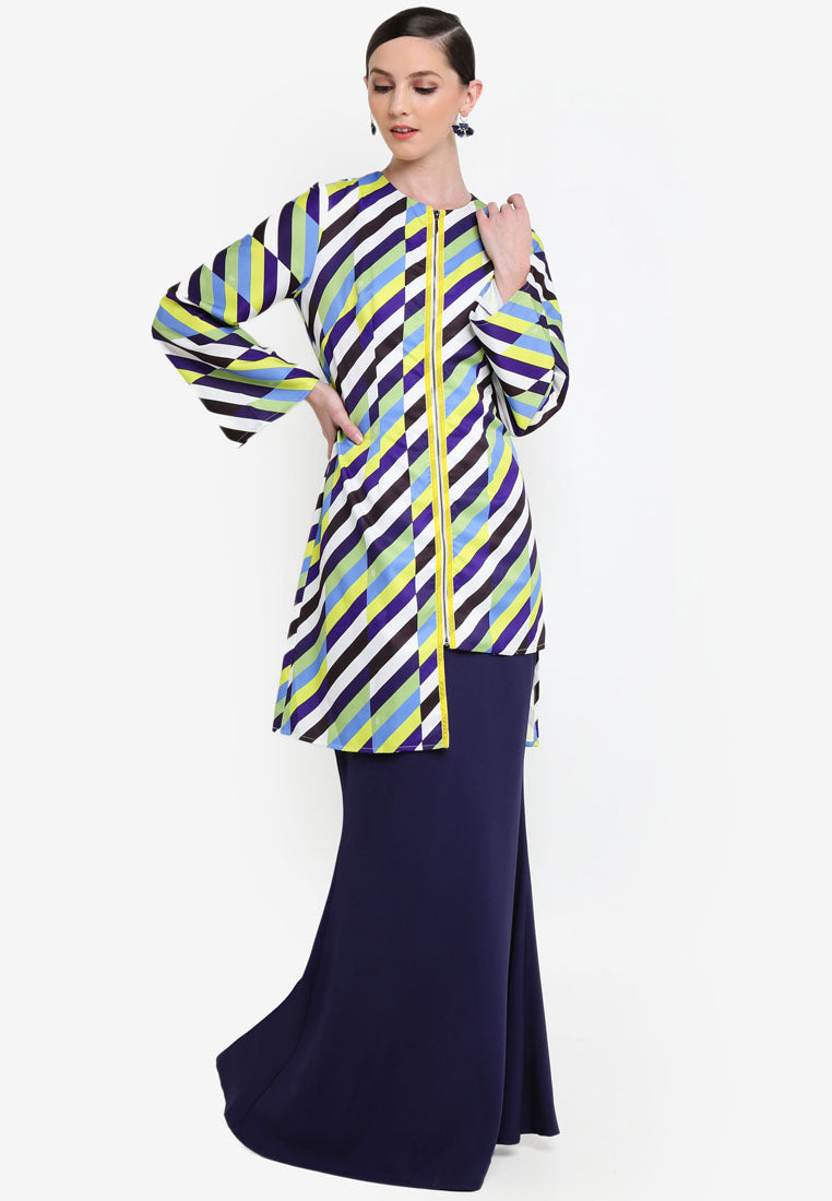 Feel cool and unique in this cool asymmetrical baju kurung. The jacket zipper gives a urban vibe for your Eid. Definitely a head turning piece by pairing it up with Navy Blue bias cut skirt