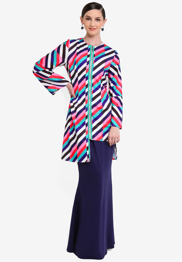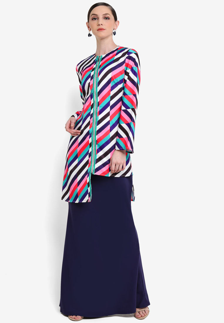 Feel cool and unique in this cool asymmetrical baju kurung. The jacket zipper gives a urban vibe for your Eid. Definitely a head turning piece by pairing it up with Navy Blue bias cut skirt