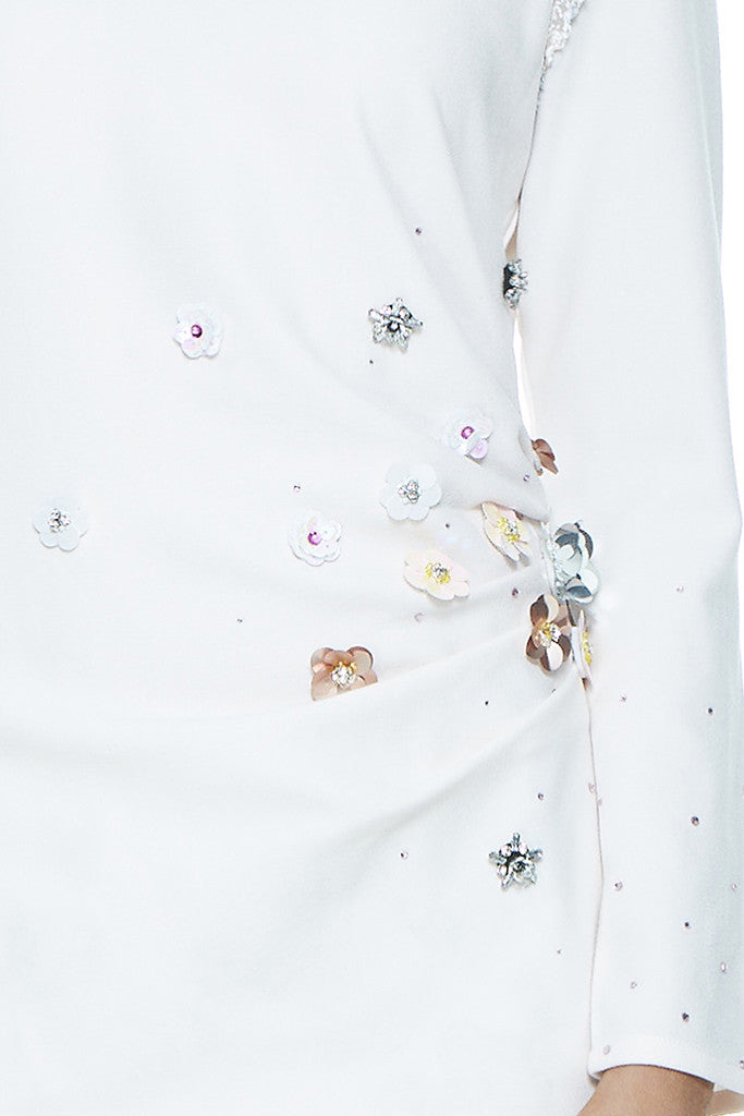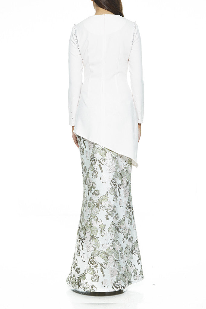 WHITE LAWANG - HEAVILY EMBELLISHED WITH SEQUIN FLOWERS AND STONES ASSYMETRICAL MODERN BAJU KURUNG WITH SIDE GATHERS ON THE WAIST (WHITE)