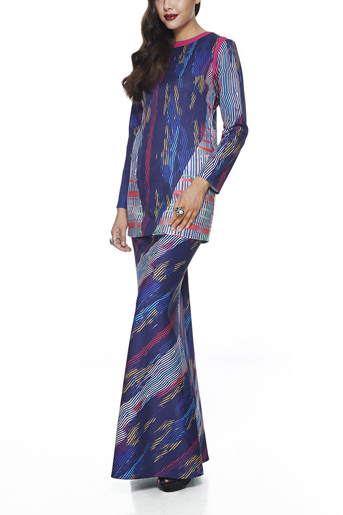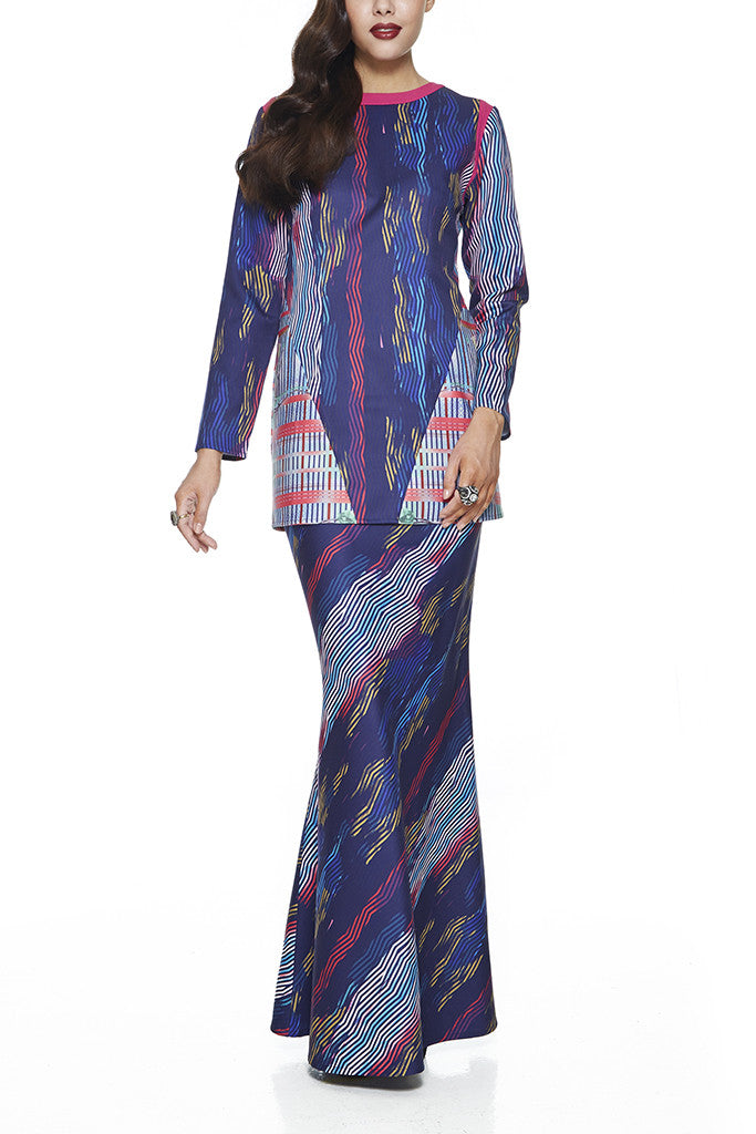 A sporty, cool look yet fashionable piece that's suitable to wear for all ladies would be the Lavender modern kurung! This fitted baju raya features 2 exclusive prints panellings on the top to give you a flattering shape, with colour contrasting neckline and on shoulder. With exclusive printed bias skirt, you'll sure wow the crowd!